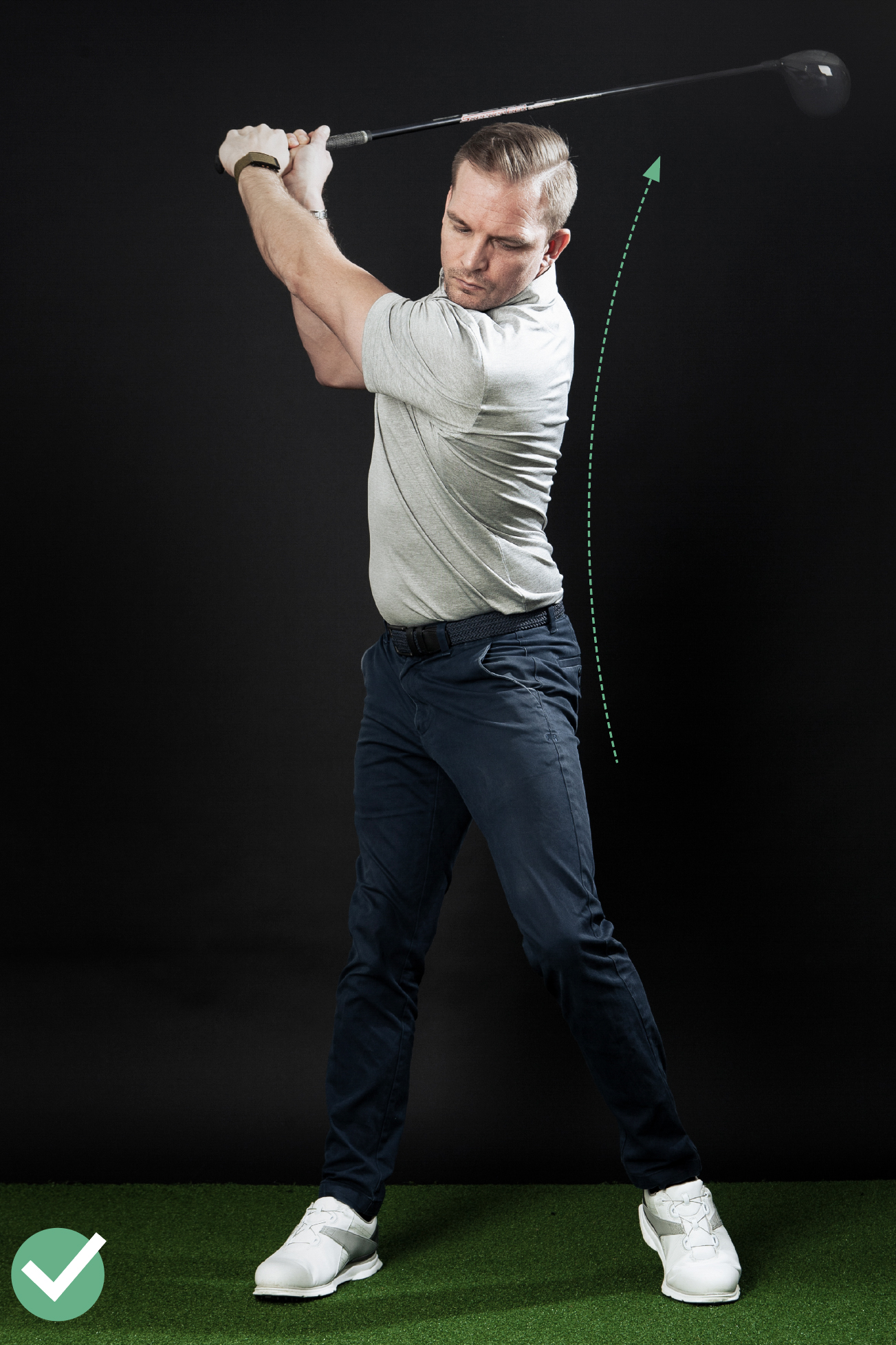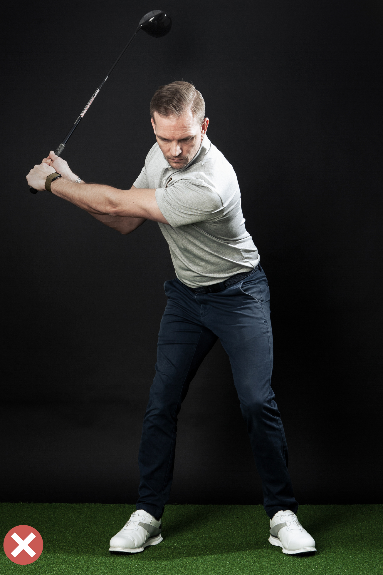 Tren på å overdrive baksvingen og gjøre den lenger ved å svinge med en så stor sirkel som mulig. Du gjør dette ved å strekke brystet og heve tyngdepunktet i kroppen. I bildeeksemplet til høyre kan du se hvordan Erik virkelig strekker seg oppover. Det er bredden i sirkelbevegelsen som deretter skaper fart ned mot ballen. På bildet til venstre ser du hvordan det ikke skal se ut. Fra denne posisjonen er det vanskelig å skape fart.